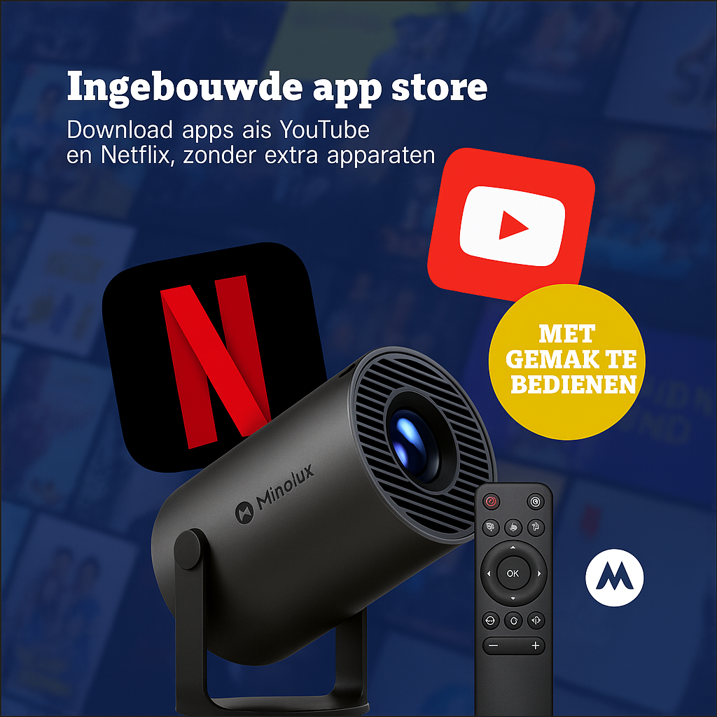 De Minolux beamer heeft HDMI-, USB-, AV- en Bluetooth-aansluitingen. Sluit in seconden je smartphone, laptop, tablet of console aan. Werkt met o.a. Chromecast, Fire TV Stick, PlayStation en meer.